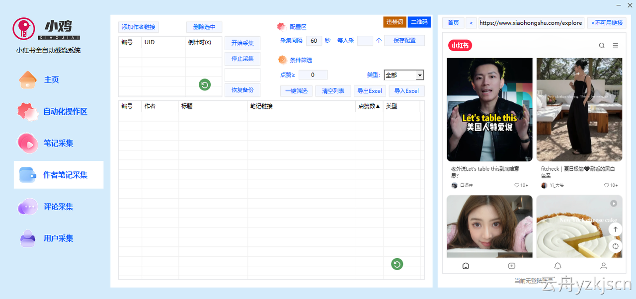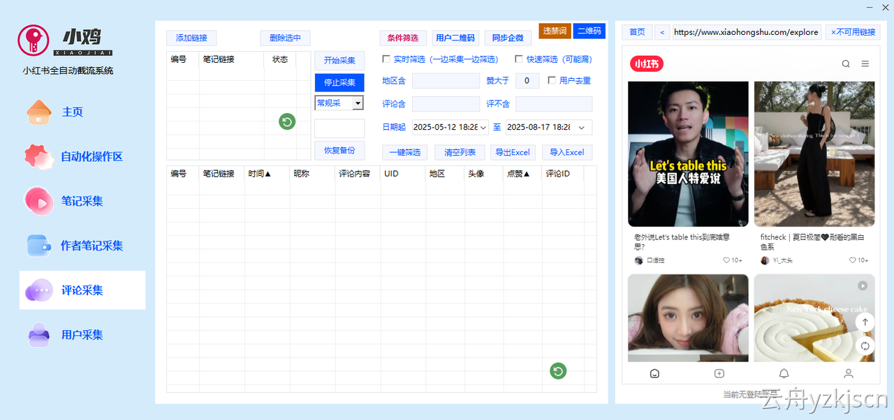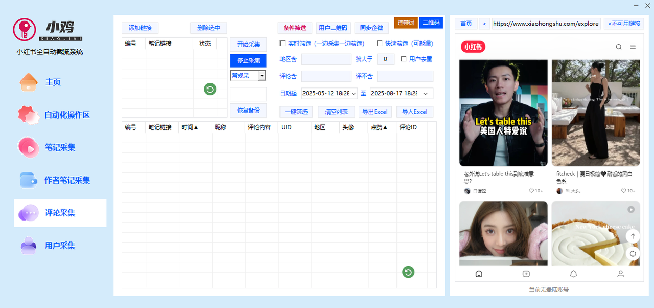 3.笔记评论采集(支持条件筛选,导出excel,支持添加用户关注截流操作)